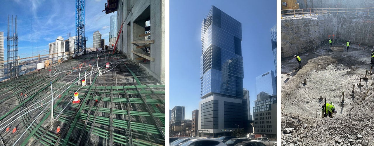 The building uses a “stacked‑box” geometry that complements its sister high-rise, the award-winning Alcove luxury apartment tower, for which GTA provided similar services. Prime includes a spread foundation bearing on the bedrock surface with an allowable bearing capacity of 200 ksf. The structure incorporates high‑strength concrete columns and beams with post‑tensioned concrete slabs. During construction, GTA’s services included daily observation of reinforcing steel installation, masonry and grout testing, post‑tensioning cable installation and stressing, and concrete placement observations, including high‑strength concrete testing.